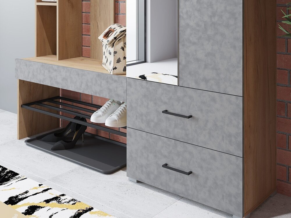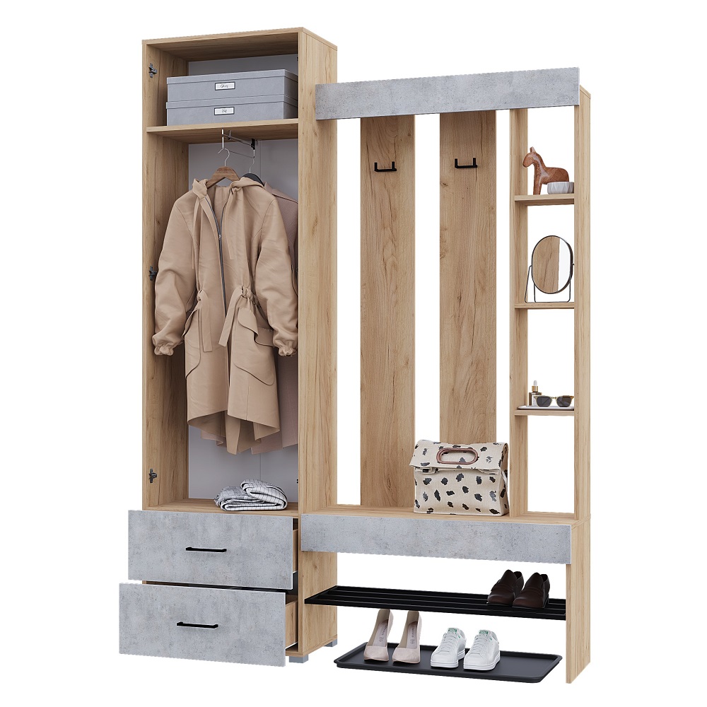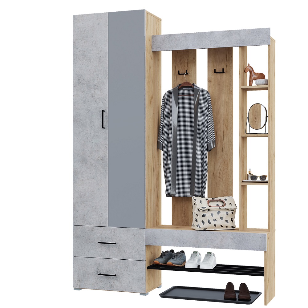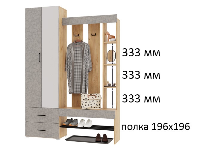 Прихожая ДОМИНО - стильная, функциональная и практичная. Идеально подойдет для малогабаритных квартир. Шкаф оборудован выдвижной штангой, предусмотрены ящики для хранения. В открытых нишах можно разместить разную мелочь и декор. Металлическая полка для обуви в сочетании в декором фасада "бетон" добавит элемент лофта в Ваш интерьер. Прихожая собирается и налево, и направо. Производится из ЛДСП в цвете: корпус - Крафт золотой, фасад - Бетон; Белый. Габаритные размеры прихожей 1500х2116х350 мм. Размеры шкафа 600х2116х350 мм (входит в габаритный размер прихожей)