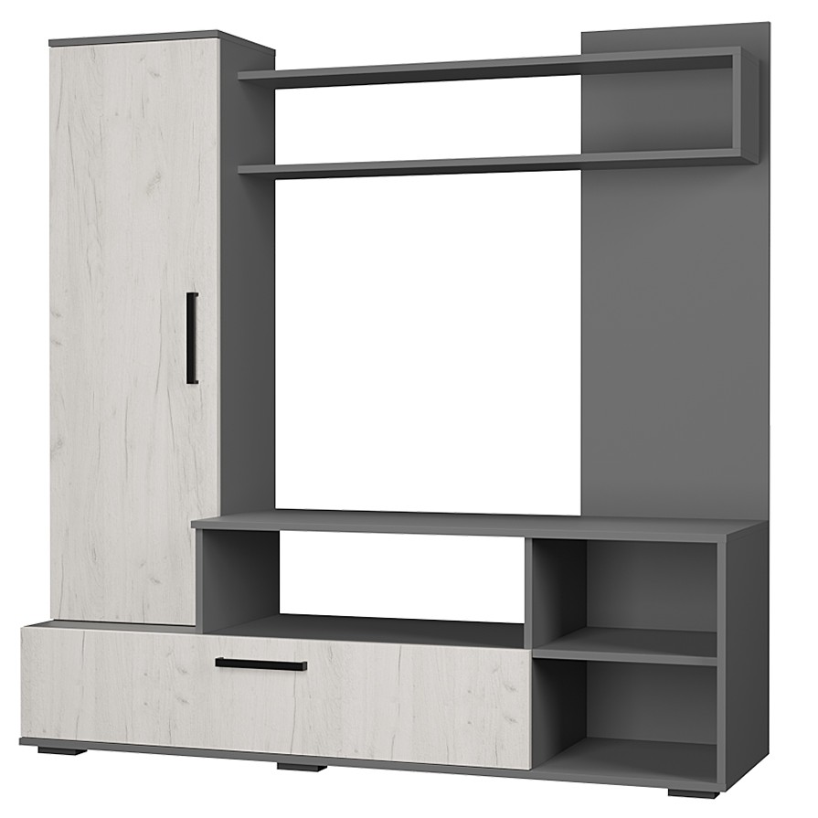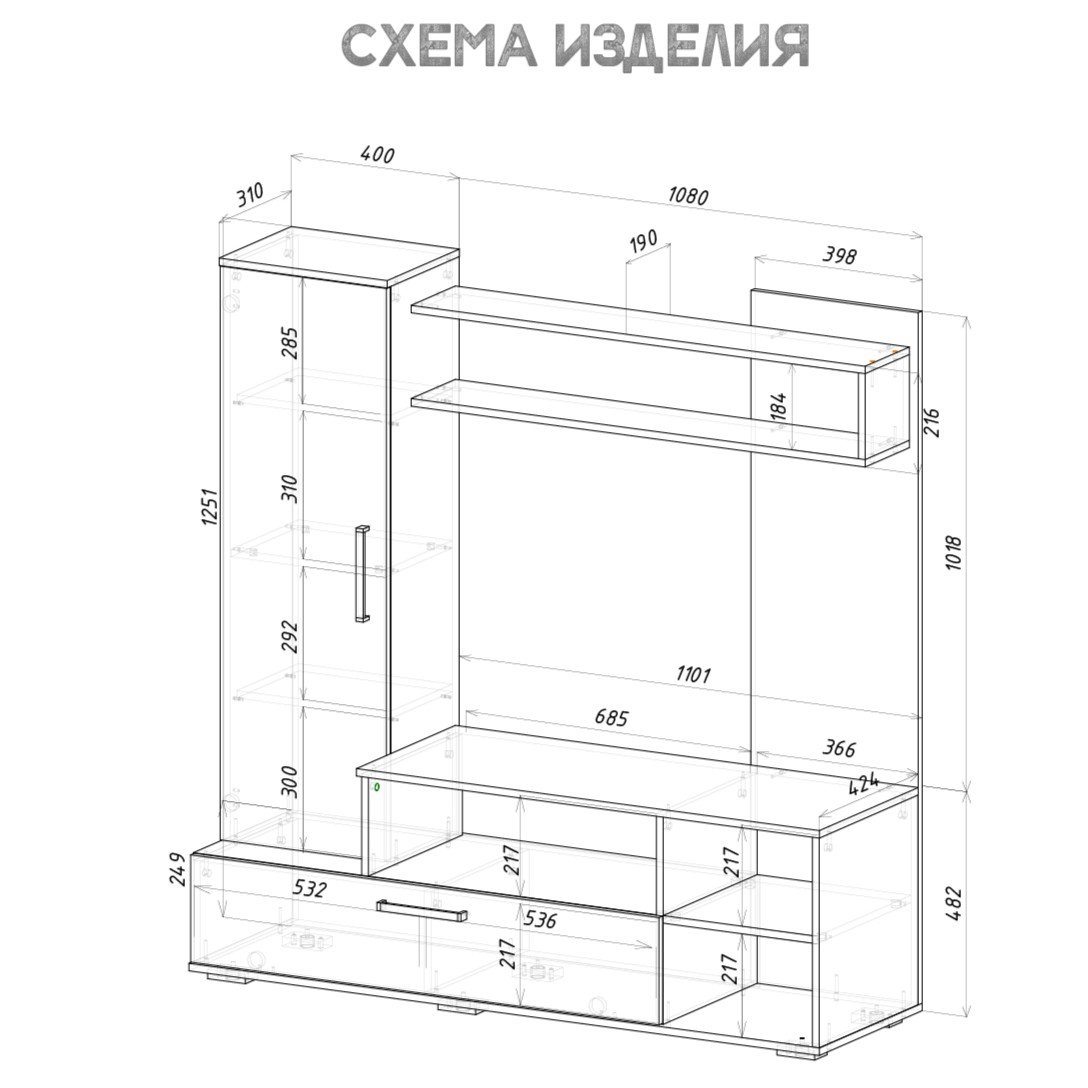 Гостиная "Евро-2" - Просторная ниша под ТВ, закрытая боковая секция для хранения крупных и мелких вещей, открывание нижней секции благодаря механизму "газлифт". Стильная полка над нишей под ТВ - место для декора. Удобные и вместительные полки под телевизором для хранения техники, книг и предметов интерьера. Ручка - пластик черная. Опоры - прямоугольные черные регулируемые. Механизм открывания нижней дверки - газлифт. Максимальная нагрузка на полку - 10 кг.