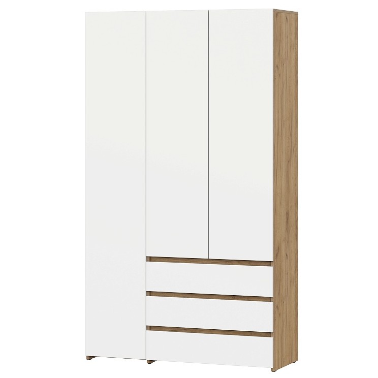 Стильный 3-створчатый шкаф в скандинавском стиле — идеальное решение для вашего интерьера! Сочетает пенальную секцию с 5 полками, просторный отдел для одежды и 3 вместительных ящика. Дизайн без ручек, лаконичные линии, отделка «дуб крафт золотой» с белыми фасадами. Функционально и эстетично!