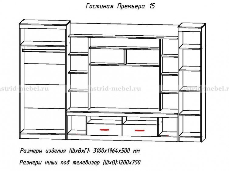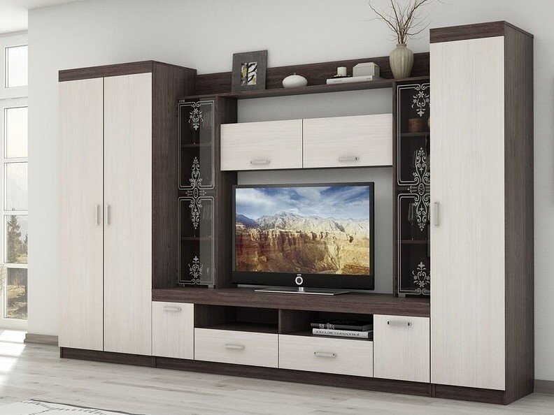 Элегантная гостиная стенка «Премьера-15» в современном стиле — стильное решение для вашей гостиной! Композиция сочетает вместительные шкафы, ТВ-зону с нишей под телевизор, изящные витрины с пескоструйным рисунком, навесную секцию и функциональные тумбы с ящиками. Выполнена в благородной гамме «ясень анкор тёмный/светлый» из практичного ЛДСП. Компактна (ширина — 3,1 м), но очень вместительна — идеально организует пространство, сохраняя уют и стиль.