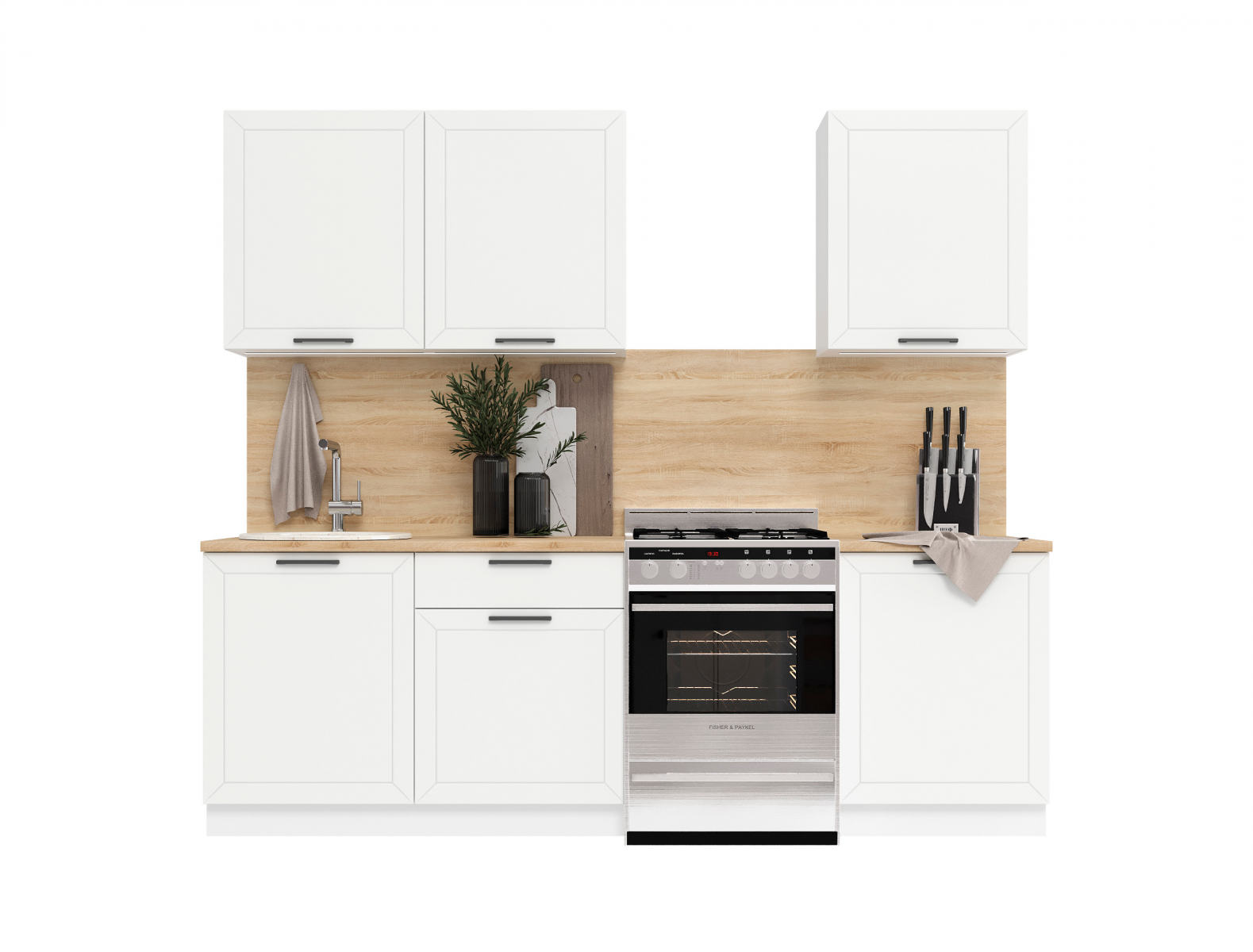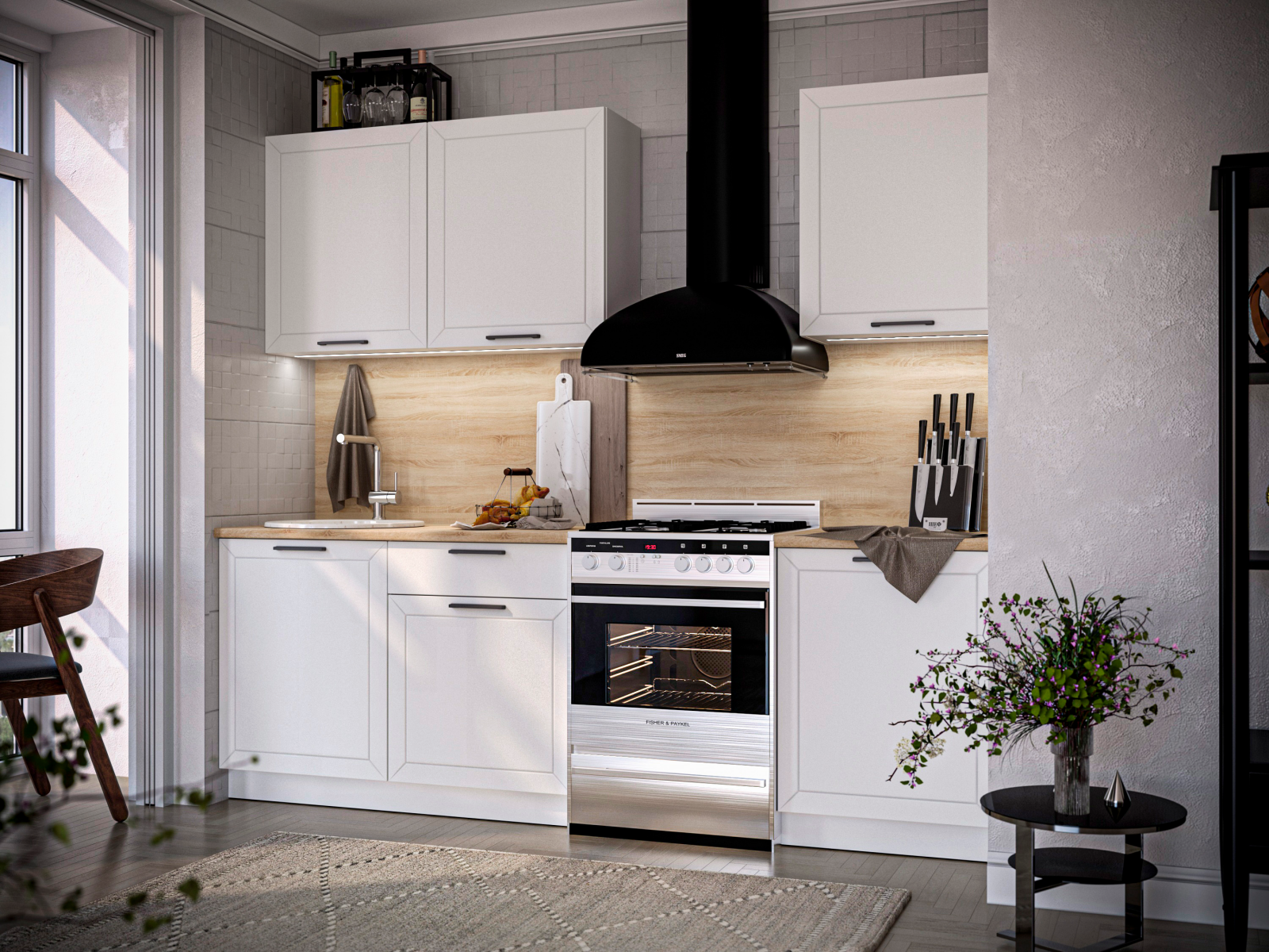 Кухня ГЛЕТЧЕР выполнена в белом корпусе и выразительном фасаде Айленд Силк. Столешница 36 мм в комплекте.